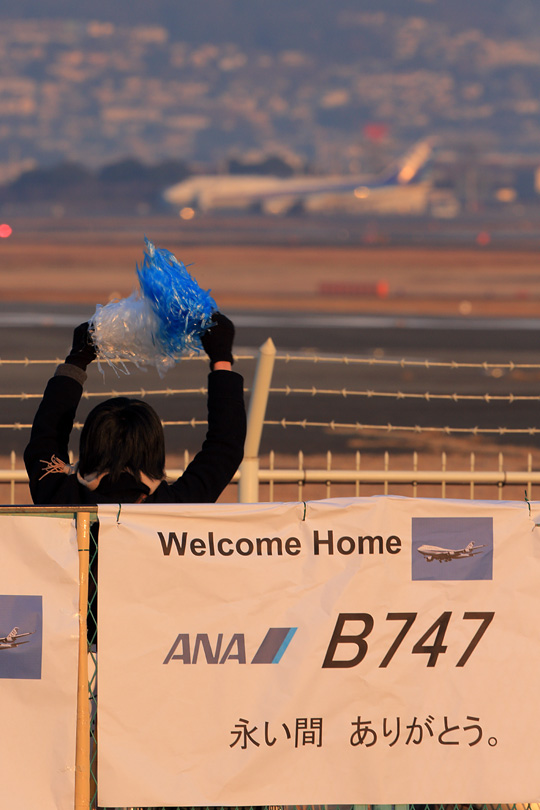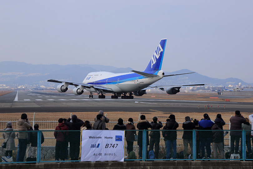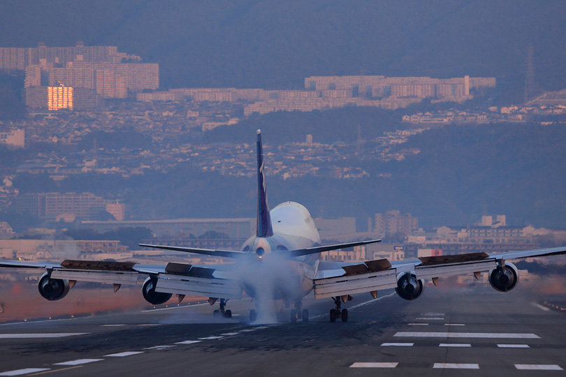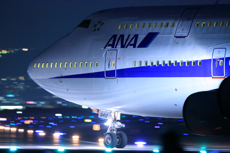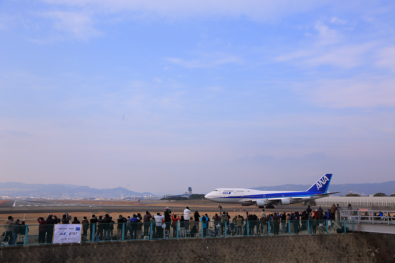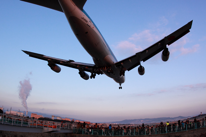 | 最後の最後はデジタル世代を試すように、完全停止なしでじわじわ行ってしまいました。 ここもANA塗装を綺麗に入れるか迷ったのですが、滑走路の幅の内側で撮りたかった。 右主翼の2基のエンジンが滑走路に並ぶ灯かりを滲ませたのを見て、 ああここに陣取って良かったなぁとしみじみ思いました。 これにて千里川土手での14時間耐久レースは終了。 トイレに行きたくならないように食事すらとらずにいたので、 曽根駅に戻る途中でたこ焼き屋を見つけて思わず注文。 焼きあがるのを待っていると、同じく注文待ちをしていた男性が 「すいません。なんか三脚持った人がいっぱい歩いてますけど、 何かあったんですか、それともこれから何かあるんですか?」 伊丹空港の飛行機の身近さとジャンボの圧倒的な存在感。 それが出会う最後の1日は、街の雰囲気が変わるほどだったようです。 バックナンバー |