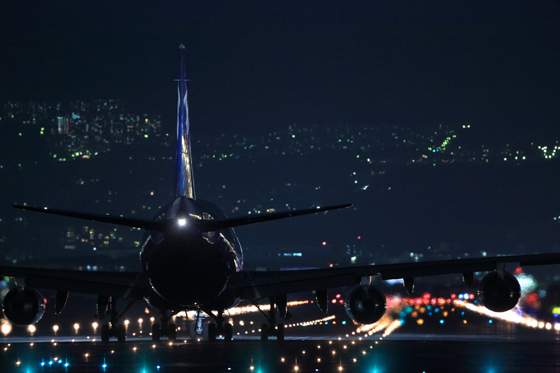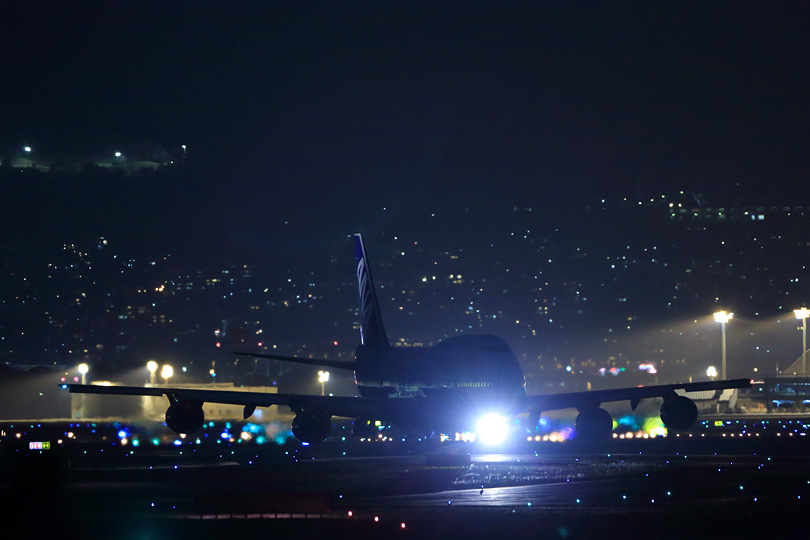 | 知り合いと三脚を並べて、最後のタキシーアウトにレンズを向けます。 背景の山に並ぶ灯かりが星空のように見える伊丹空港。 |