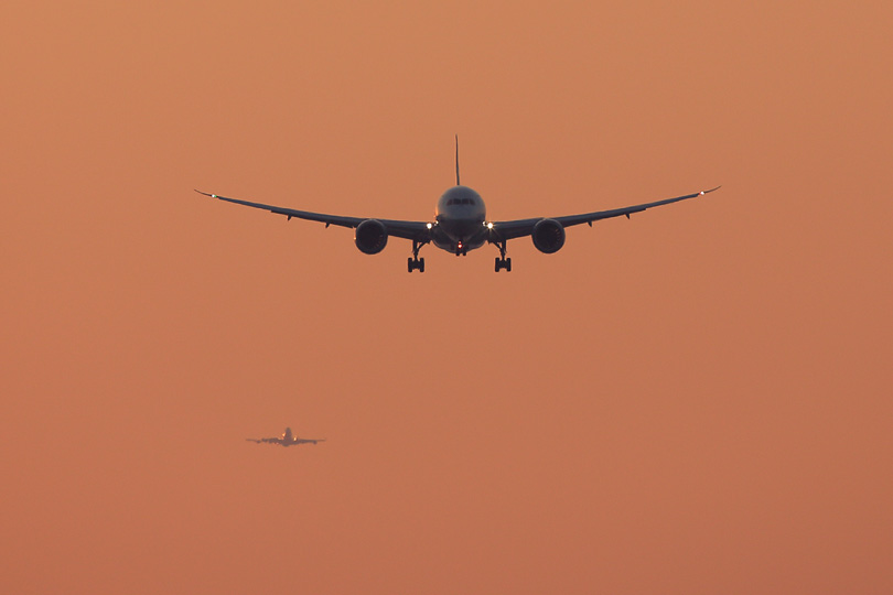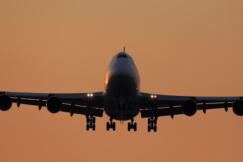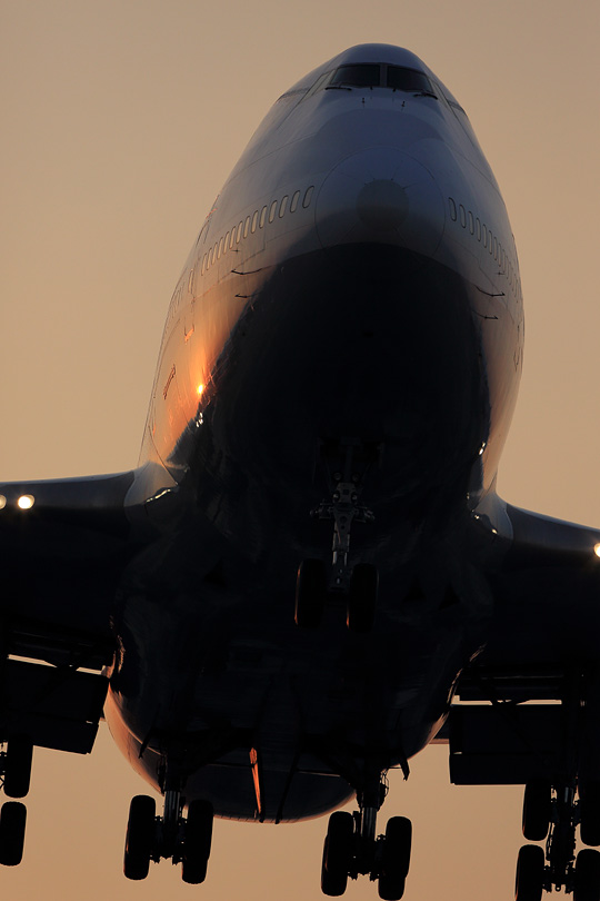 | 日の出直後の千里川土手。 朝イチの到着に来るのは航空ファンだけかと思いきや、 ご家族連れっぽい方々なども集まって既に大盛況。 TさんのFacebookに、定期便の787に続いて羽田を飛び立ったことが書き込まれていたので Flightradarで787の位置をチェックしながら待ちます。 「来たっ!」 787のスラリと主翼を伸ばしたシルエットの後ろに見えたのは、 見まごうことのない4発の王者のシルエット。 |