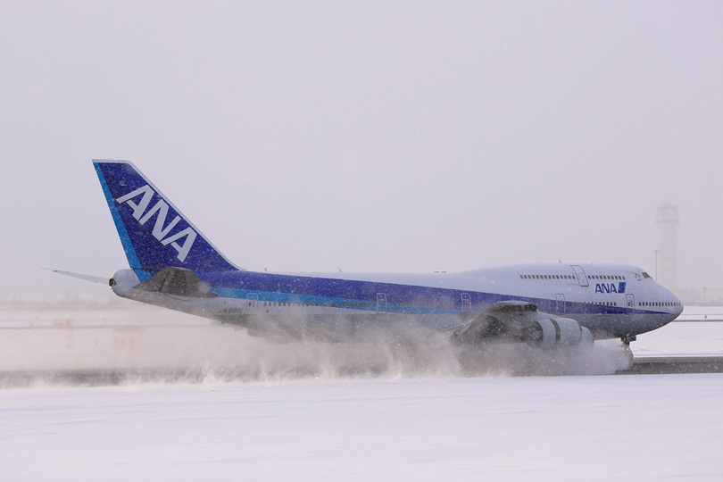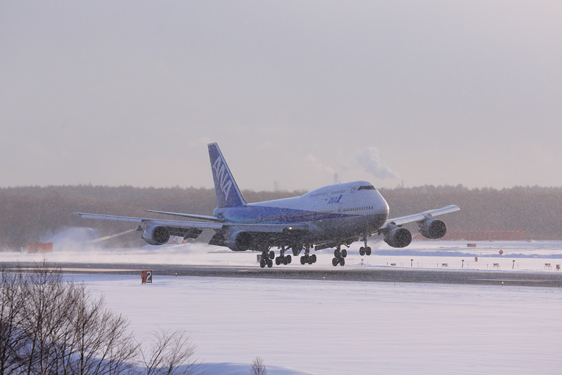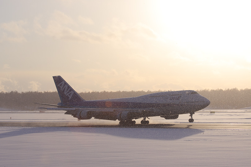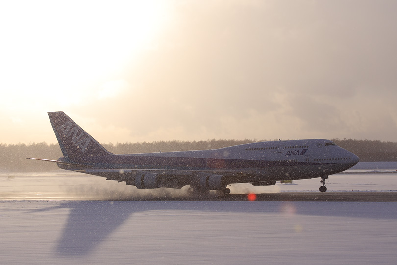 | 逆光が舞い降りる雪を浮かび上がらせ、地面にはジャンボの影を映し出しました。 待った甲斐がありました。 |