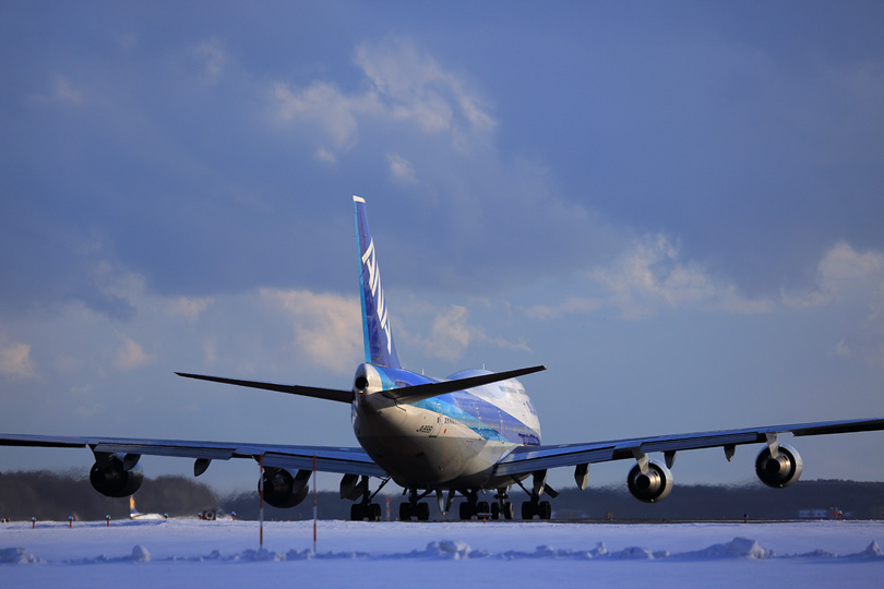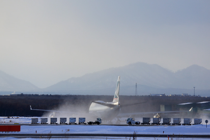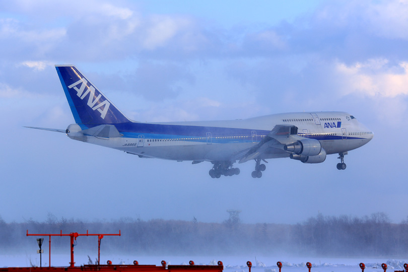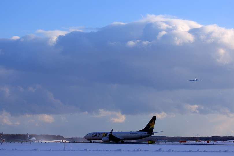 | で、着陸機のほうを選んでカメラを向けました。 「・・・ん?なんだこの雪煙は?」 先に離陸していったジャンボが巻き上げたものでした(笑) |