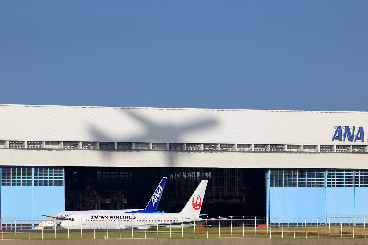 離陸する767の影がハンガーの壁を高速で這っていきます。