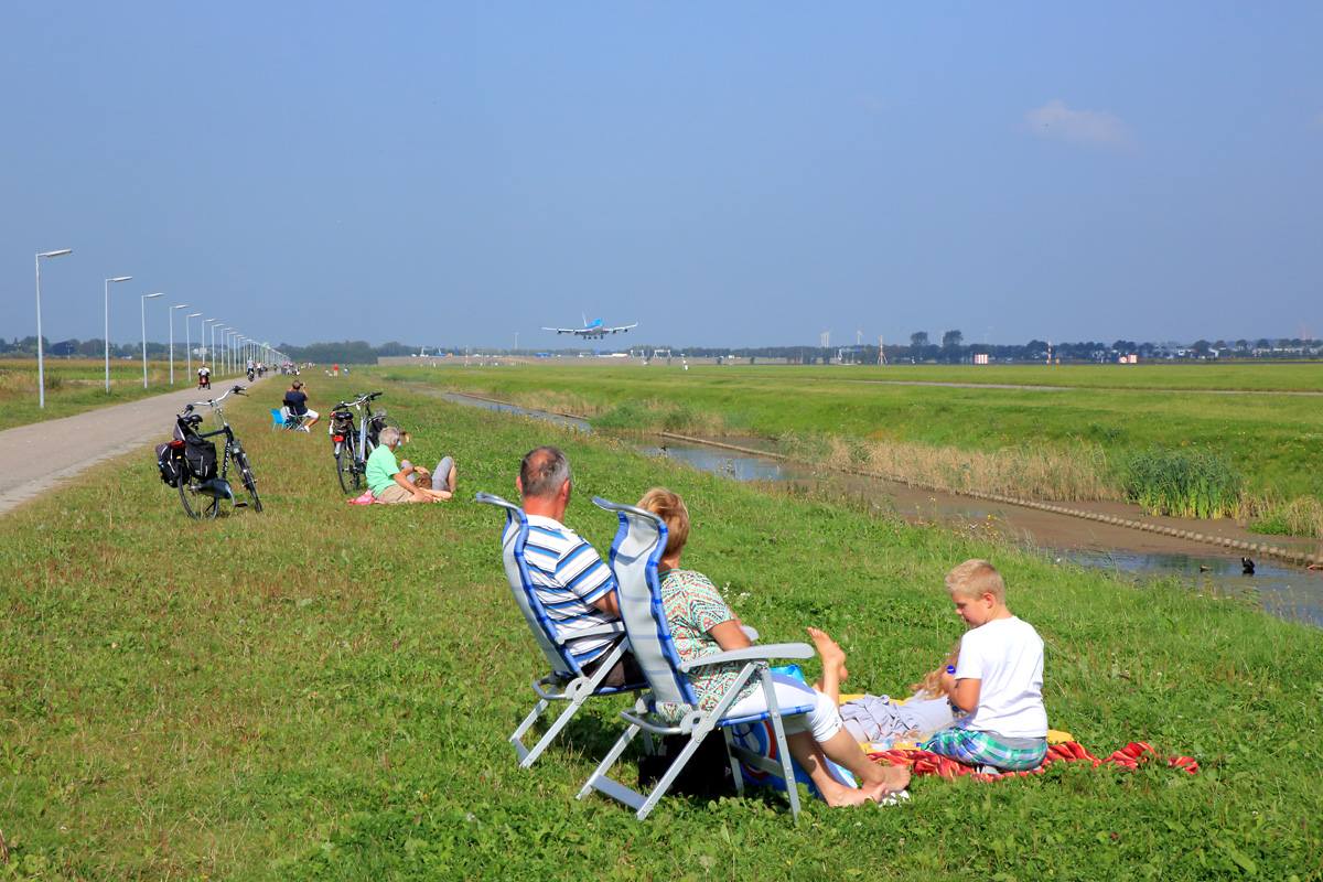 | ほうら、いいところでしょう(^-^)(^-^)(^-^)。 例によってフェンスなしですから、楽な姿勢で飛行機ウォッチングを楽しめます。 ポルダーバーンはスキポール空港の6本の滑走路の中でターミナルから一番遠い滑走路ですが、 市街地への騒音の影響が一番少ないため、常にメイン滑走路として使われるようです。 なお、北風のときは離陸、南風のときは着陸、いずれかの専用になります。 ちなみにこの写真は、KLMのMD-11の出発を撮るために自転車を漕いできたら、 いつのまにかランチェンして着陸滑走路になっていたときのもの。 「まじかー!」といいつつこの1機だけ撮って引き返し、 12キロ離れた間反対の滑走路(離陸に使われる滑走路)に向かったのでした。 |