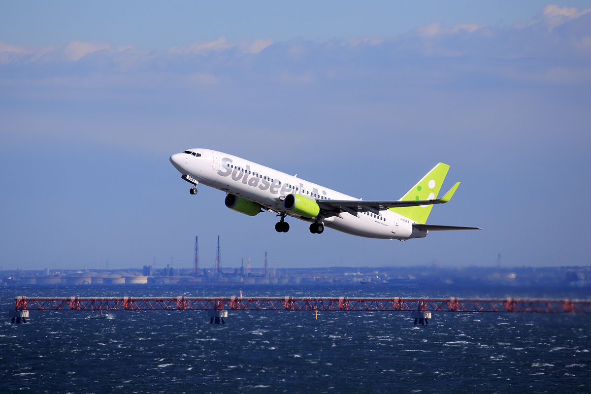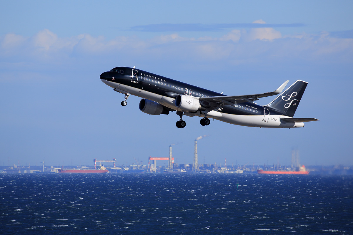 | 強烈な北西の風でD滑走路が横風となり、一時的にほとんどの出発機がC滑走路から離陸する事態に。 普段2タミのデッキからでは手に負えない九州便の離陸が撮れました。 |