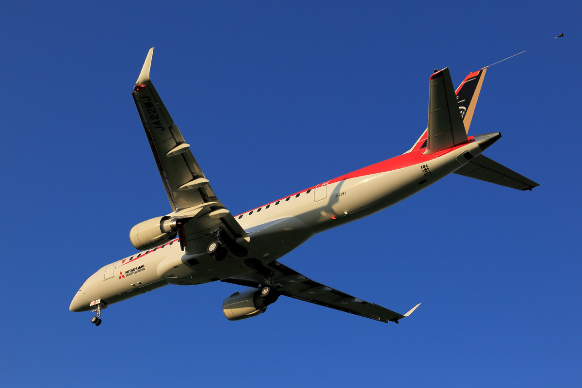 日没前の光がほぼ真横から差してウイングレットの影が胴体に映る。