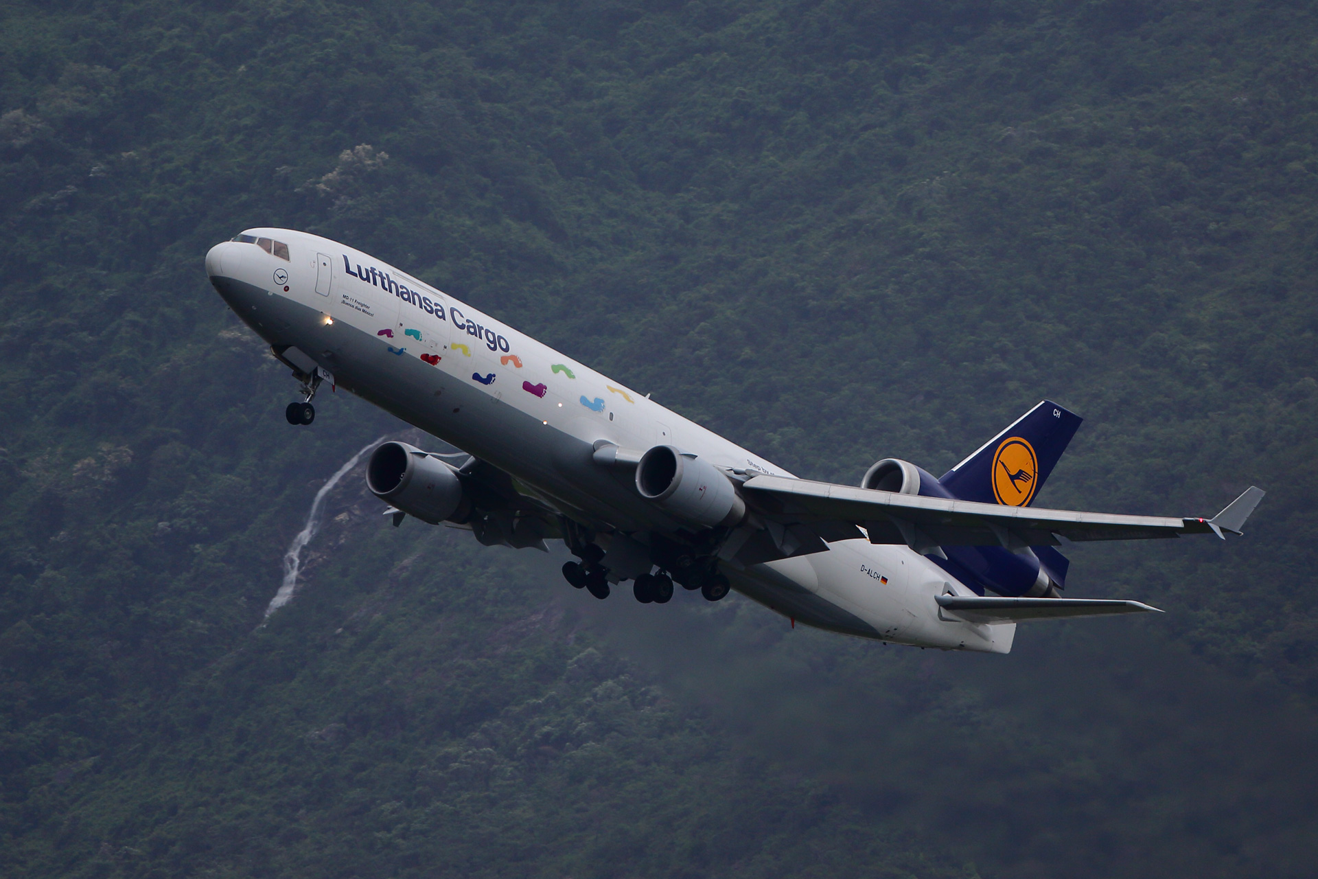 | 撮影2日目。週に1度だけルフトハンザカーゴが昼間に上がる日曜日。 生憎の雨模様、というか結構しんどい大雨でしたが、 背景に写ってる滝は翌日にはただの岩場になっていたので これはこれで雨の日限定のシーンということで。 |