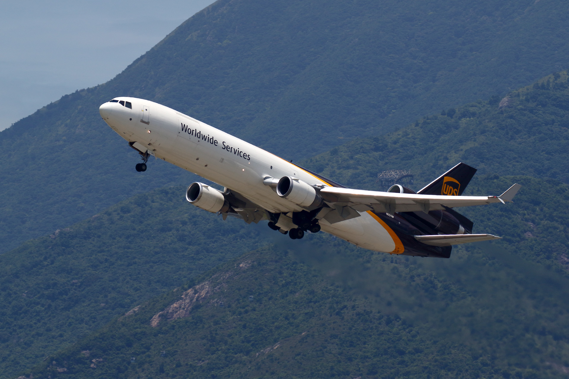 | 撮影4日目。やっと晴れ・・・たと思ったら香港の南海上に台風があるという理由でデッキが閉鎖。 「昨日までちょいちょい嵐が来てもふつうに開いてたやん!今日のほうが穏やかやん!」 とブツブツ言いつつ仕方なく第1ターミナル出発階のバス寄せで撮影しました。 正午ごろに出るドバイ行きのUPSが滑走路に入ったのをフライトレーダーで確認。。 ここはターミナル屋根の陰から急に飛び出してくるので気が抜けません。 一応その前にターミナルの窓越しに一瞬見えるはずなのですが 「・・・あれ? もしかしていま通った?」 下のほうを何かが横切った気がしたかもと思った10秒後。 「うわっ!そこ!?」 予想よりずいぶん低く飛び出してきて大焦り。 危うくフレームアウトしそうになりつつ何とか撮れたというオチでした。 デッキ閉鎖の「おかげ」で結果的にいい位置で山に絡んでくれたこのショットを今回のベストとしたいと思います。 2018年7月15〜17日 香港国際空港 バックナンバー 戻る |