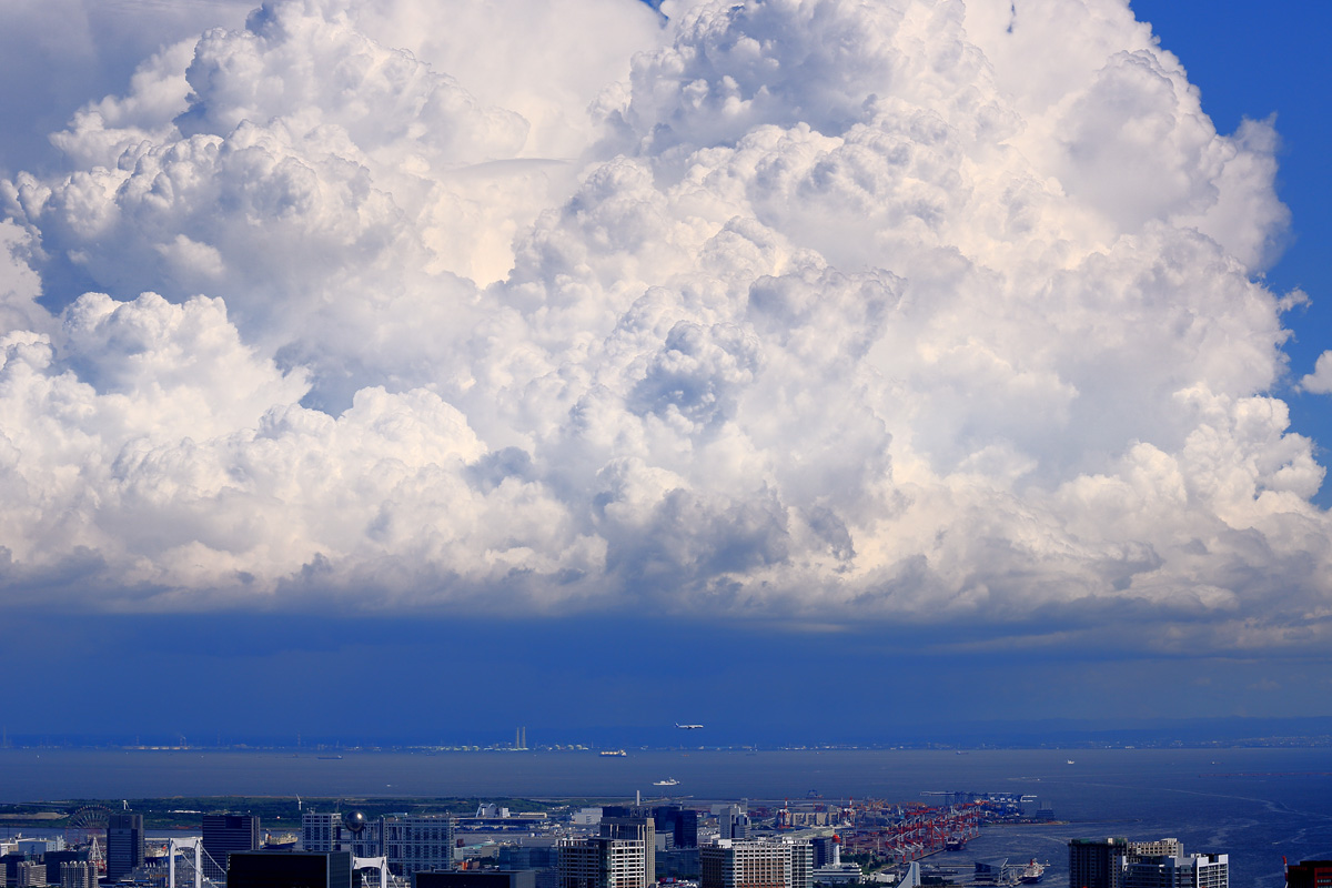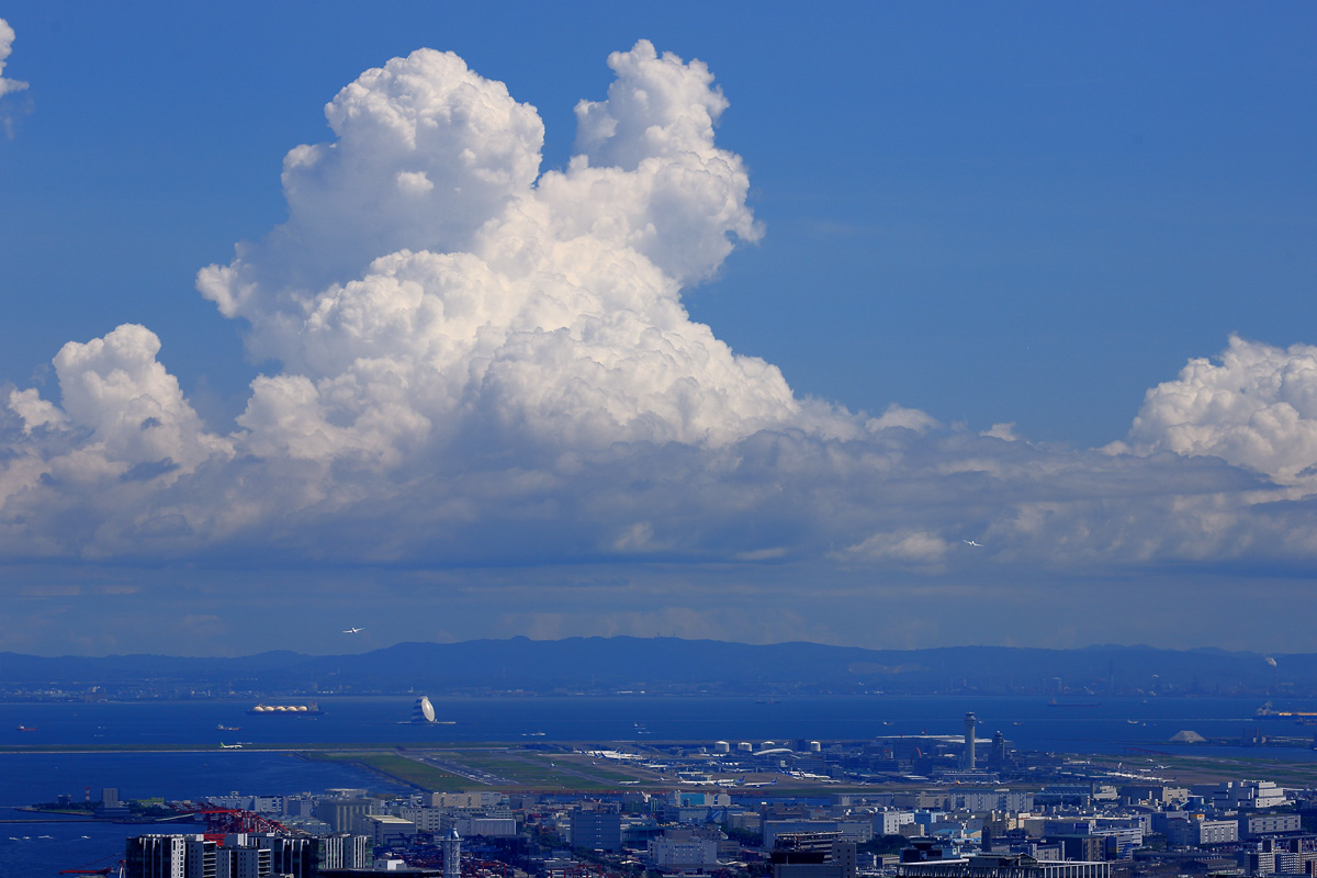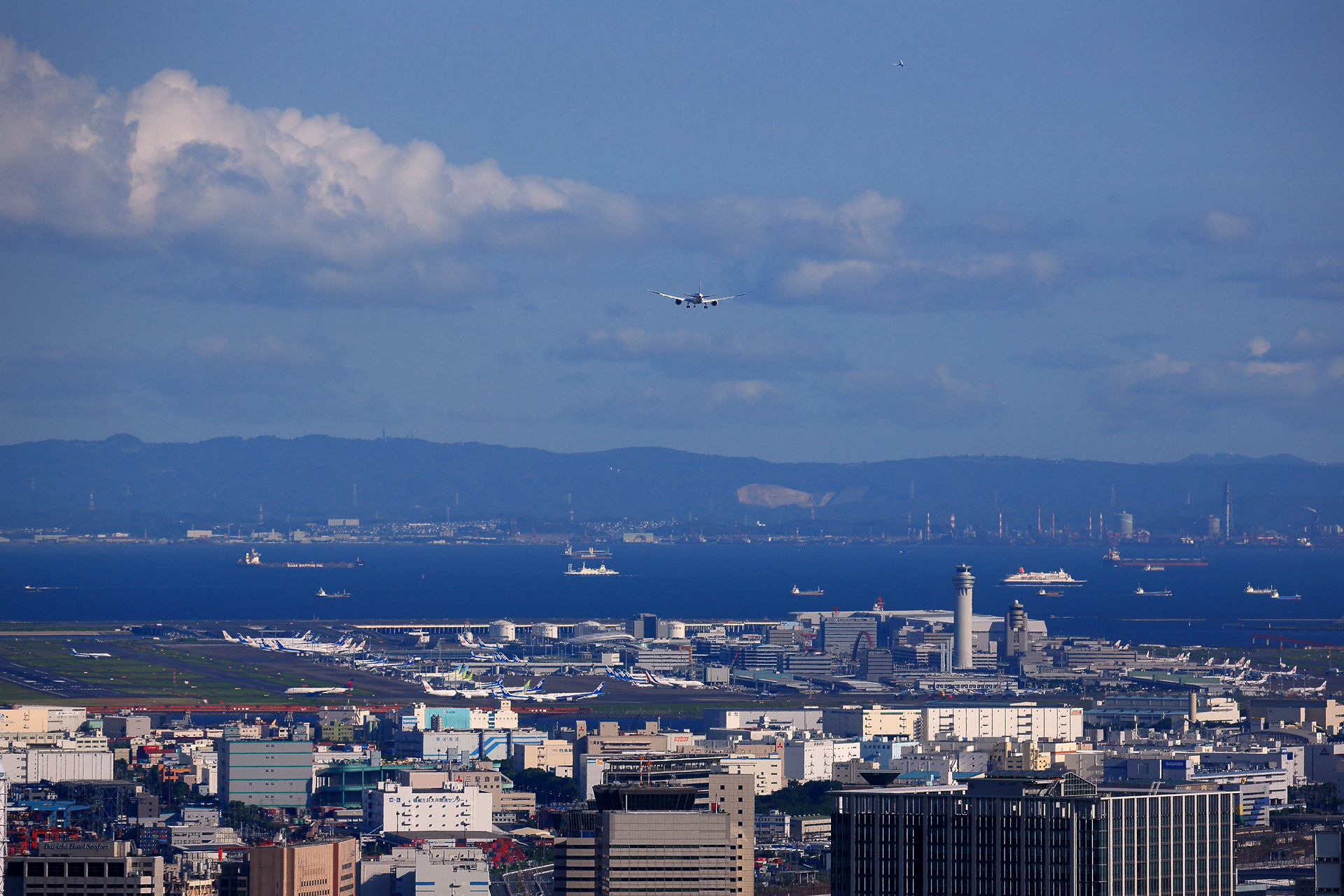 | 屋上が閉鎖になったあとも屋内展望台で撮影続行。 15時からいわゆる「南風運用時の新ルート」での着陸となりました。 この日は暑かったのに陽炎の影響は不思議なほど小さく、羽田空港に並ぶ飛行機がクッキリ見える絶好の状況。 フランスのVIP機もしっかりわかりますね。数えてみたら飛行機が85機も写っていました。 背景の海にも多くの船が行き交っていて、さながら乗り物図鑑の見開きページのよう。 貨物船だけではなくて管制塔の右側には客船「にっぽん丸」、2タミの向こうには伊豆航路の「さるびあ丸」もいます。 これは大きなプリントで隅々まで眺めるのが楽しいタイプの写真だと思います。 写真をクリックして大きな画像でご覧ください。スマホ画面ではなくてPCのモニタでぜひ(^-^ゞ 2021年7月23日 六本木ヒルズ スカイデッキ・スカイギャラリー バックナンバー 戻る |