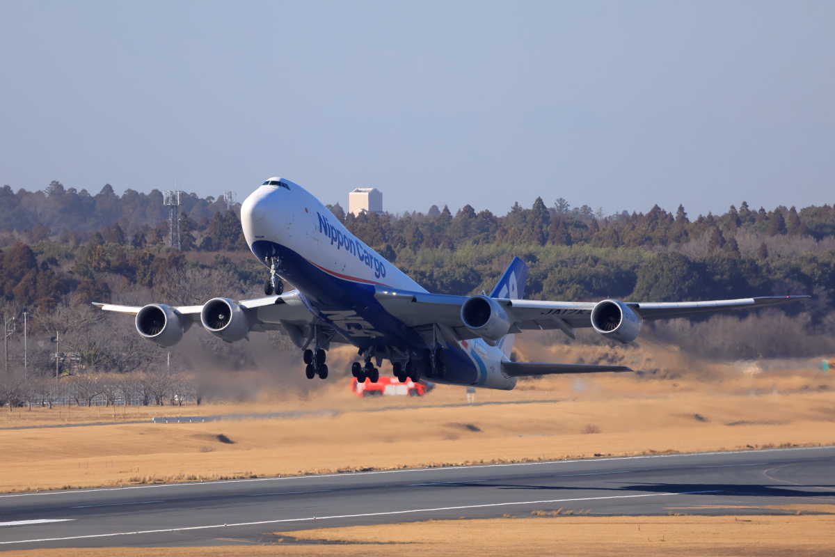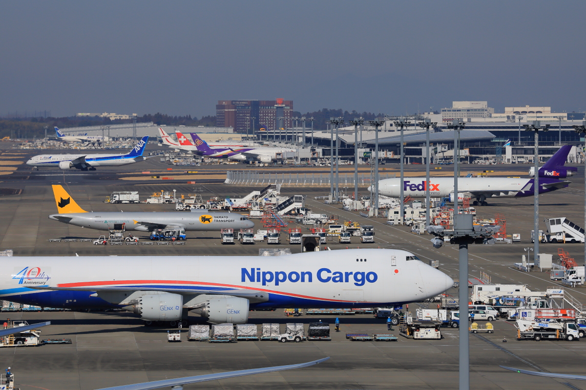 一般開放されるようになった航空博物館屋上より、カーゴ大中小。